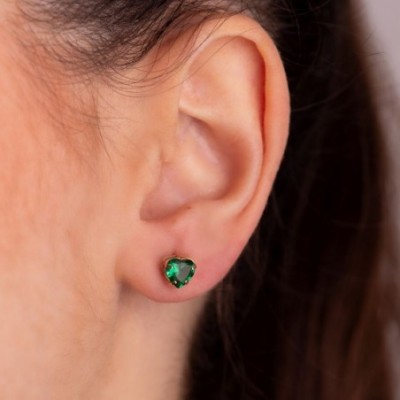 Clous d'oreilles coeur en or massif, zircon vert émeraude 5 mm - Marie