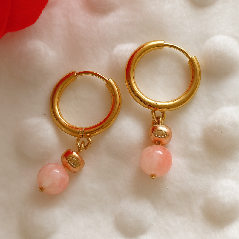 Les boucles Rosalia révèlent toute la délicatesse du rose marbré de la pierre persane, sublimée par l’éclat doré des créoles fines.